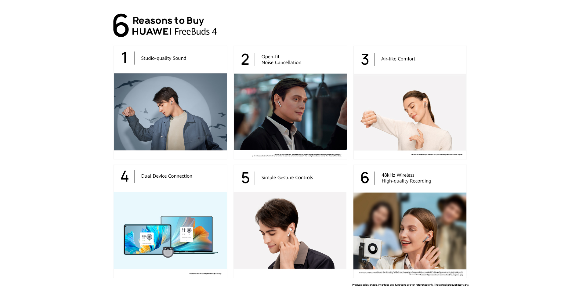 T0004 HUAWEI Kirin A1 Bluetooth 5.2 A2DP 1.3 HFP 1.7 AVRCP 1.6 Charged via the charging case Supports up to 3 C charging current. It takes around 1 hour to fully charge the earphones. Data comes from Huawei lab tests. Tested at an ambient temperature of 25°C, with the charging coil of the charging case placed at the center of the wireless charger. Earphone battery capacity: 30 mAh (typical value) Battery type: Lithium-ion polymer battery Weight: 1.69 g Music playback duration: 2.5 hours (with noise canceling enabled) 4 hours (with noise canceling disabled) Voice call duration: 2 hours (with noise canceling enabled) 3 hours (with noise canceling disabled) *Data comes from Huawei lab tests. A prototype of the HUAWEI FreeBuds 4 and the accompanying software were tested with a HUAWEI P40 Pro running EMUI 11.0. For details of phones running EMUI 11.0, refer to the corresponding FAQ. Music playback test: The earphones were connected to a phone over Bluetooth. Music was then played in 256 kbps AAC format, with the volume set to 50%. The music was left playing until sound stopped playing from one of the earphones. Voice call test: The earphones were connected to a phone over Bluetooth with the volume set to 50%. A voice call was then made, and continued until the voice could no longer be heard from one of the earphones. The battery life will vary depending on the device settings, usage, and other factors. Tested at an ambient temperature of 25°C, with the volume set to 50%. 20 Hz to 20,000 Hz AAC and SBC 1. The send/receive loudness, noise floor, frequency response, and distortion, as well as echo, comply with the calling standard TS26131-32. 2. Noise cancellation performance during calls The earphones integrate Huawei's noise canceling algorithms, giving them a reception TMOS of 3.7 or greater, and a transmission POLQA of 3.5 or greater. 14.3 mm large LCP dynamic driver unit Triple microphones, supporting uplink noise cancellation during calls; Two of them support ANC Ceramic White Red Silver Frost Each earphone: approx. 4.1 g (Note: Actual product weight will vary depending on the configuration and manufacturing process.) 41.4 mm x 16.8 mm x 18.55 mm Operating temperature: 0°C to 35°C Charging temperature: 0°C to 48 °C Storage temperature: –20°C to 45°C Obtained SRRC and BQB Bluetooth certificates. Comply with the RoHS and halogen-free environmental protection requirements. HUAWEI FreeBuds 4 T0004C (Wireless charging edition) T0004L (Wired charging edition) Charged via a USB-C port A Function button is available. 1. Enter Pairing mode: Open the charging case and leave the earphones inside. Press and hold the Function button for more than 2 seconds. 2. Perform a factory reset: Open the charging case and leave the earphones inside. Press and hold the Function button for more than 10 seconds. This will clear all pairing data. The indicator outside the case provides information about the earphones and charging case by turning red, yellow, green, or white. 1. Charging status of earphones: none 2. Battery level of earphones: Medium: yellow/orange Alarm: red Sufficient: green 3. Pairing status: flashing white quickly 4. Factory reset status: flashing red quickly 5. Charging status of the case: Charging: yellow/orange Alarm: red Fully charged: green 6. Battery level of the case: none 5 V/1.6 A Wired charging: A full charge of both the charging case and earphones takes around 90 minutes. A full charge of the charging case takes around 60 minutes. Wireless charging: A full charge of both the charging case and earphones takes around 3 hours. A full charge of the charging case takes around 2.5 hours. *Data comes from Huawei lab tests. During testing, the temperature is 25°C, and the charging coil on the case faces the center of the wireless charger. Fully charged earphones, with support of a fully charged case, provide 22 hours of music playback with ANC disabled, or 14 hours of music playback with ANC enabled. When the charging case is fully charged, it can fully charge both earphones four times, or fully charge a single earphone eight times. *Data comes from Huawei lab tests. During testing, the temperature is 25°C and the earphones are fully charged when the test starts. Battery capacity: 410 mAh (minimum value) Battery type: Lithium-ion polymer battery Weight: approx. 9.5 g Note: Actual product weight will vary depending on the configuration and manufacturing process. Ceramic White Red Silver Frost Charging case only: approx. 38 g Note: Actual product weight will vary depending on the configuration and manufacturing process. 58 mm x 21.2 mm Operating temperature: 0°C to 35°C Charging temperature: 0°C to 50°C Storage temperature: –20°C to 45°C Obtained the CE and FCC safety certificates. Comply with the RoHS and halogen-free environmental protection requirements. 1. Dual-channel true wireless stereo, with synchronous data transmission via both earphones After connecting to a Bluetooth device, the earphones will play stereo sound through both channels when making voice calls or playing music. They intelligently designate one earphone as primary and the other as secondary based on their condition and battery level. 2. Hybrid ANC via dual microphones Both the inner and outer microphones detect and eliminate ambient noise in each earphone. The dynamic driver generates reverse sound waves to cancel out noise precisely and play crystal clear sound. 3. Immersive audio experience The optimized 14.3 mm dynamic driver unit uses the LCP macromolecular composite diaphragm, which is light and slim and effectively improves the high-frequency sensitivity, reproducing full and rich audio details. An independent, highly enclosed acoustic cavity is used at the back of the audio emitting unit, and it forms a low-frequency amplifier with a large-volume low-frequency tube connected to the outside. When the air flows in the low-frequency tube, the diaphragm's vibration to low-frequency sound is enhanced 