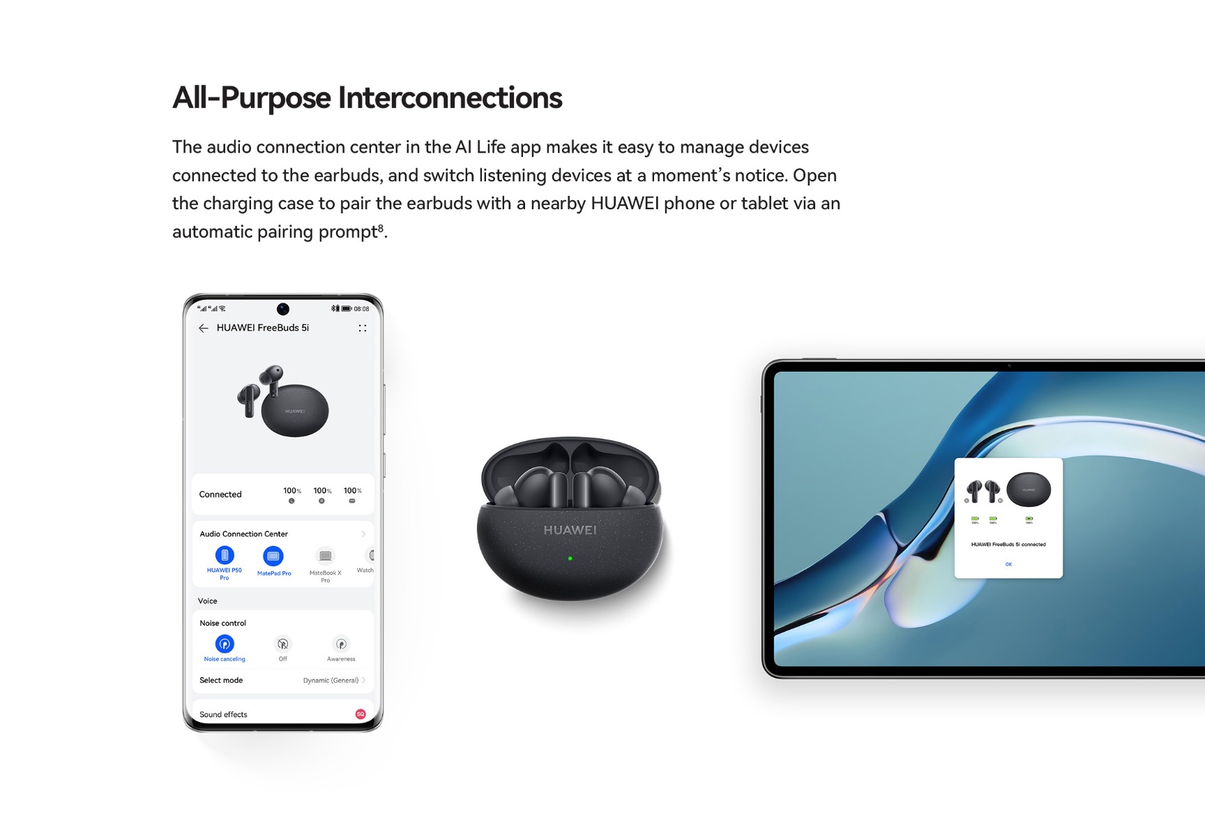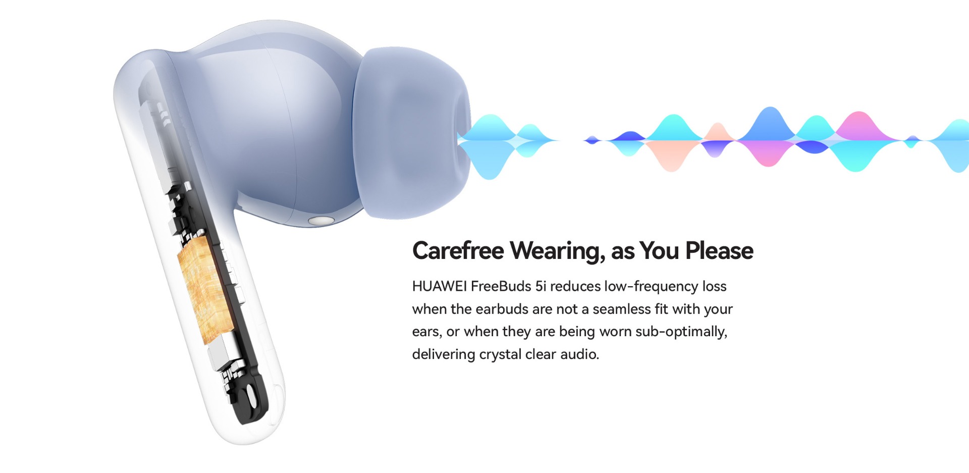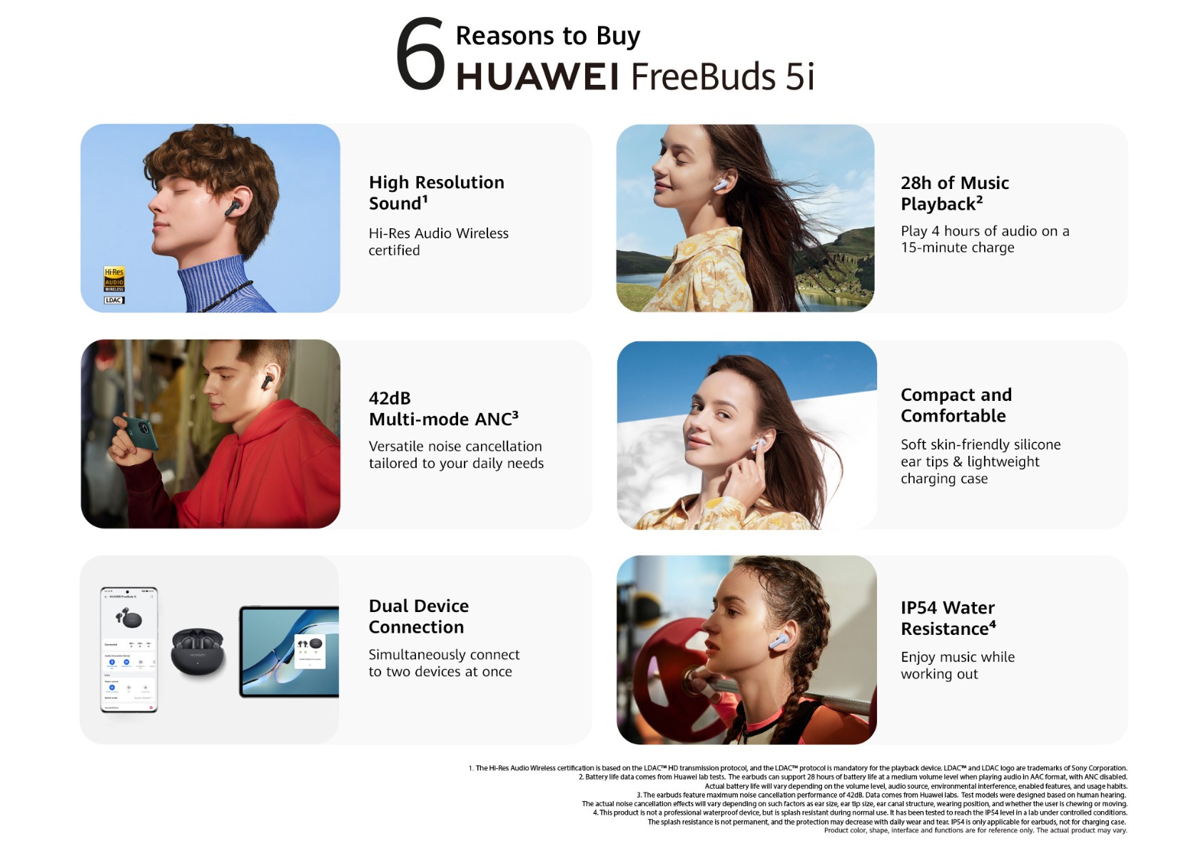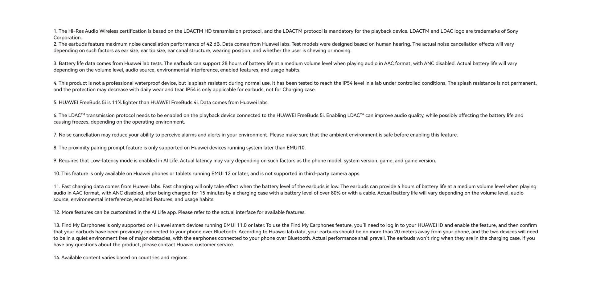 | Specifications | SPCG00018550 HUAWEI FreeBuds 5i Specifications – Huawei Global HUAWEI FreeBuds 5i is Hi-Res certified, featuring a wide frequency response, and full-link high-resolution sound for HD audio sources. 42 dB multi-mode active noise cancellation allows you to make adjustment on demand, and provides a comfortable listening experience. Find out more specifications. HUAWEI FreeBuds 5i, HUAWEI FreeBuds 5i specifications, HUAWEI FreeBuds 5i specs, HUAWEI FreeBuds 5i data 30.9 mm 21.7 mm 23.9 mm About 4.9 g±0.2 g 48.2 mm 61.8 mm 26.9 mm About 33.9 g±1.0 g *Product size, product weight, and related specifications are theoretical values only. Actual measurements between individual products may vary. All specifications are subject to the actual product. Ceramic White Nebula Black Isle Blue Active noise cancellation, Call noise cancellation, Transparency Mode Hall sensor/Cap sensor 10 mm dynamic driver BT 5.2 Supported* Supported *Requires smartphones running EMUI10 or above. Per earbud: 55 mAh (min)* Charging case: 410 mAh (min)* Music playback on 1 charge: 6.0 hours (with ANC enabled)** Music playback on 1 charge: 7.5 hours (with ANC disabled)** Music playback with charging case: 18.5 hours (with ANC enabled)** Music playback with charging case: 28 hours (with ANC disabled)** About 60 minutes for the earbuds (in the charging case)*** About 110 minutes for charging case without earbuds (wired)*** *Actual capacity may vary slightly. **The battery life data come from Huawei labs with conditions by default: volume at 50%, and the AAC mode is enabled. The actual battery life may vary depending on the volume, audio source, environment interference, product features, and usage habits. ***The charging data come from Huawei labs with the test condition: 25°C at normal temperature conditions. Press control: twice/long press Swipe control: up/down Press IP 54 *This product is not a professional waterproof device, but is splash resistant during normal use. It has been tested to reach the IP54 level in a lab under controlled conditions. The splash resistance is not permanent, and the protection may decrease with daily wear and tear. Earbuds Charging case Silicone ear tips (three sizes)(Available in large, medium, and small sizes. The medium-sized pair is attached by default.) USB-C charging cable Quick start guide (including safety information) Warranty card |