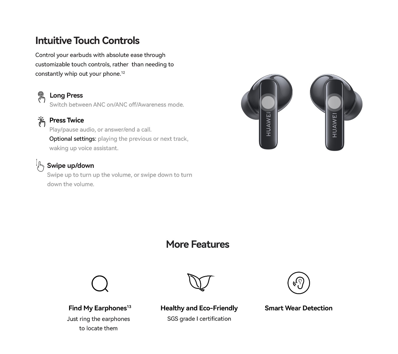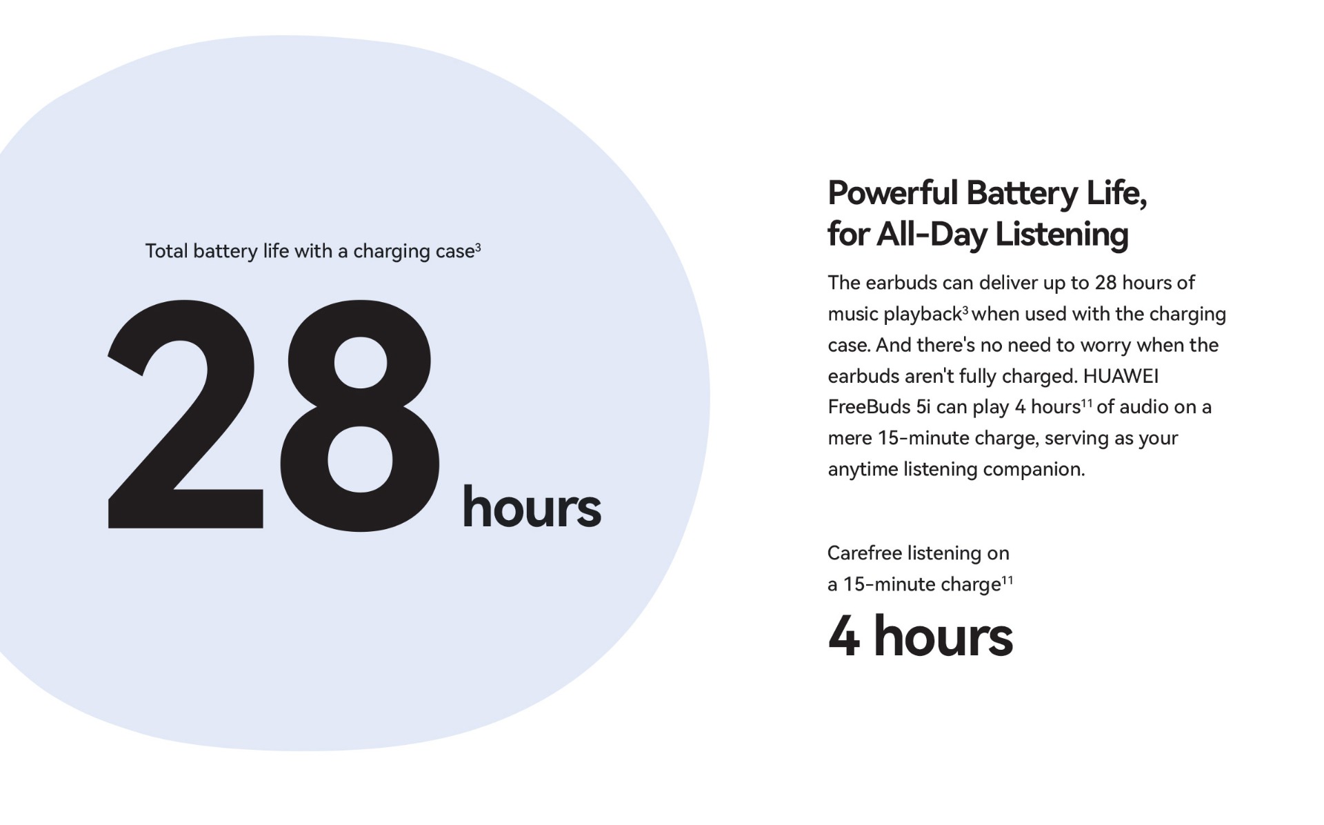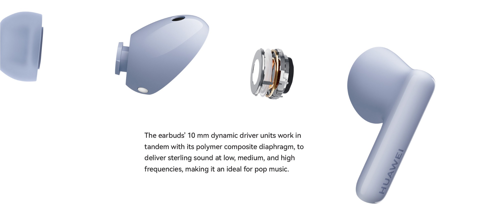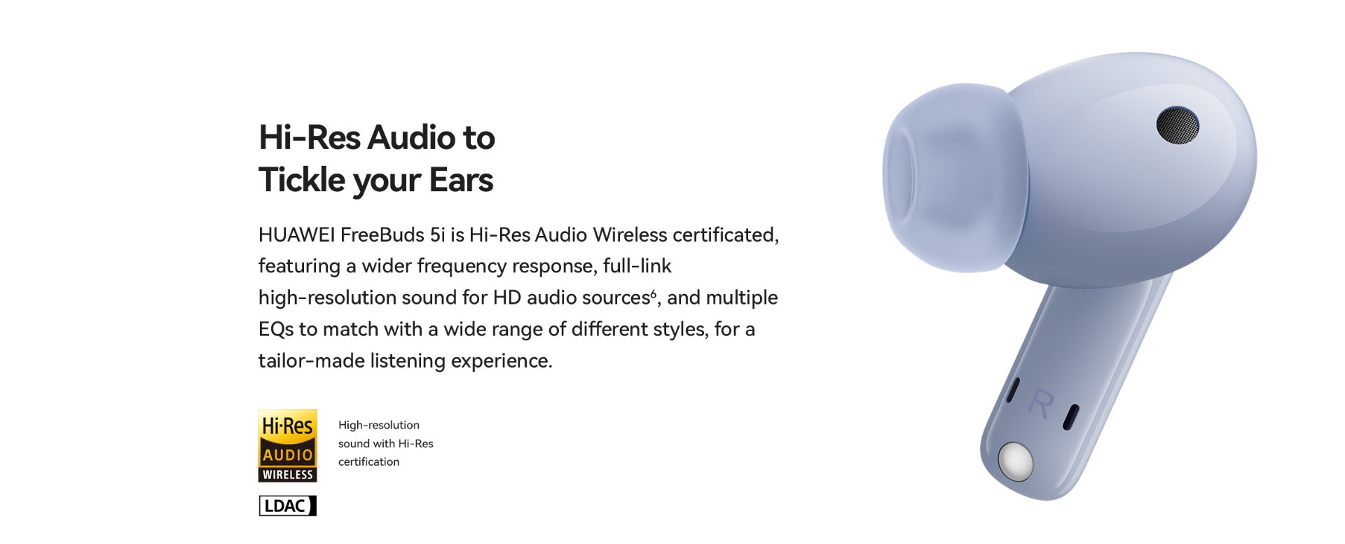 | Specifications | SPCG00018550 HUAWEI FreeBuds 5i Specifications – Huawei Global HUAWEI FreeBuds 5i is Hi-Res certified, featuring a wide frequency response, and full-link high-resolution sound for HD audio sources. 42 dB multi-mode active noise cancellation allows you to make adjustment on demand, and provides a comfortable listening experience. Find out more specifications. HUAWEI FreeBuds 5i, HUAWEI FreeBuds 5i specifications, HUAWEI FreeBuds 5i specs, HUAWEI FreeBuds 5i data 30.9 mm 21.7 mm 23.9 mm About 4.9 g±0.2 g 48.2 mm 61.8 mm 26.9 mm About 33.9 g±1.0 g *Product size, product weight, and related specifications are theoretical values only. Actual measurements between individual products may vary. All specifications are subject to the actual product. Ceramic White Nebula Black Isle Blue Active noise cancellation, Call noise cancellation, Transparency Mode Hall sensor/Cap sensor 10 mm dynamic driver BT 5.2 Supported* Supported *Requires smartphones running EMUI10 or above. Per earbud: 55 mAh (min)* Charging case: 410 mAh (min)* Music playback on 1 charge: 6.0 hours (with ANC enabled)** Music playback on 1 charge: 7.5 hours (with ANC disabled)** Music playback with charging case: 18.5 hours (with ANC enabled)** Music playback with charging case: 28 hours (with ANC disabled)** About 60 minutes for the earbuds (in the charging case)*** About 110 minutes for charging case without earbuds (wired)*** *Actual capacity may vary slightly. **The battery life data come from Huawei labs with conditions by default: volume at 50%, and the AAC mode is enabled. The actual battery life may vary depending on the volume, audio source, environment interference, product features, and usage habits. ***The charging data come from Huawei labs with the test condition: 25°C at normal temperature conditions. Press control: twice/long press Swipe control: up/down Press IP 54 *This product is not a professional waterproof device, but is splash resistant during normal use. It has been tested to reach the IP54 level in a lab under controlled conditions. The splash resistance is not permanent, and the protection may decrease with daily wear and tear. Earbuds Charging case Silicone ear tips (three sizes)(Available in large, medium, and small sizes. The medium-sized pair is attached by default.) USB-C charging cable Quick start guide (including safety information) Warranty card |