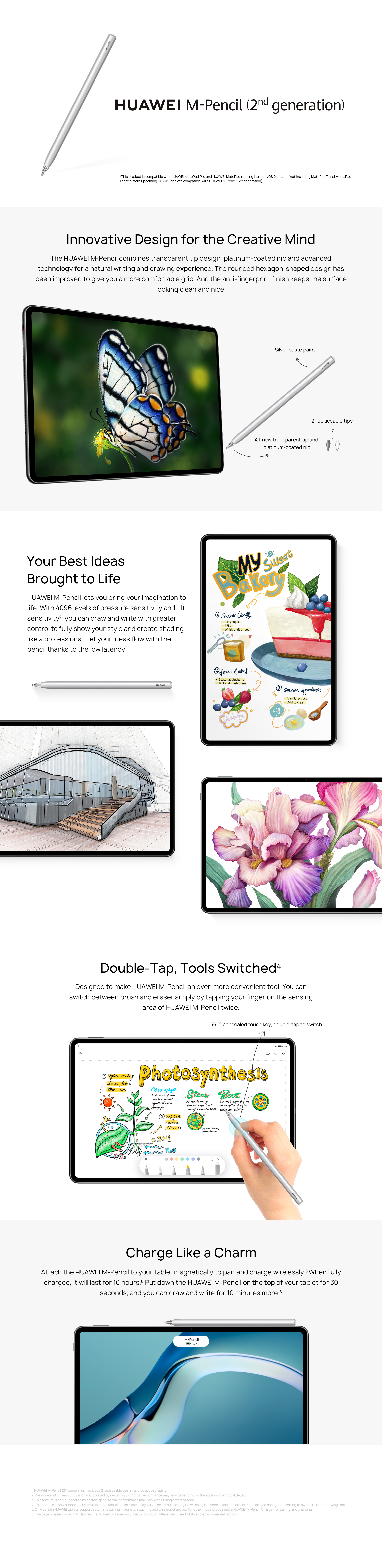 Integrated design Metallic silver 160 mm x φ8.9 mm (max), width: 8.7 mm (min) Note: The actual dimensions may vary depending on the configurations, manufacturing processes, and measurement methods. About 16 g (including the battery) Note: The actual weight may vary based on the configurations, manufacturing processes, and measurement methods l Touch button (can be double-tapped in some apps to switch features) Bluetooth 5.1 Bluetooth range: 2402–2480 MHz, 13 dB Bluetooth pairing: Attached magnetically and paired automatically Pairing for the first time: Touch the pairing icon in the pairing pop-up window. Not supported Charged by a wireless charger Cannot charge other devices Capacity: 82 mAh, lithium polymer battery Charging time: Less than 1 hour Note: The above data comes from Huawei lab tests during which the tablet was charged by a standard charger with its screen turned off. The actual charging time may vary. Input: 5V-300 mA Note: A Huawei tablet or a C-CD52-Adapter is required. HPP protocol Acceleration sensor Voltameter Pressure sensor Operating temperature: 0°C to 35°C Storage temperature: –20°C to +45°C 5% to 95% Water resistance during daily use RoHS certification (China), SRRC certification, and BT certification CE (pan-European), RoHS (pan-European), REACH (pan-European), WEEE (pan-European), KC (South Korea), Telec (Japan), IC (Canada) l Not supported l Not supported l Not supported l Not supported Wagner table and MatePad Pro. (supports magnetic charging) MatePad 10.8". (Does not support magnetic charging, use a C-CD52-Adapter instead.) |