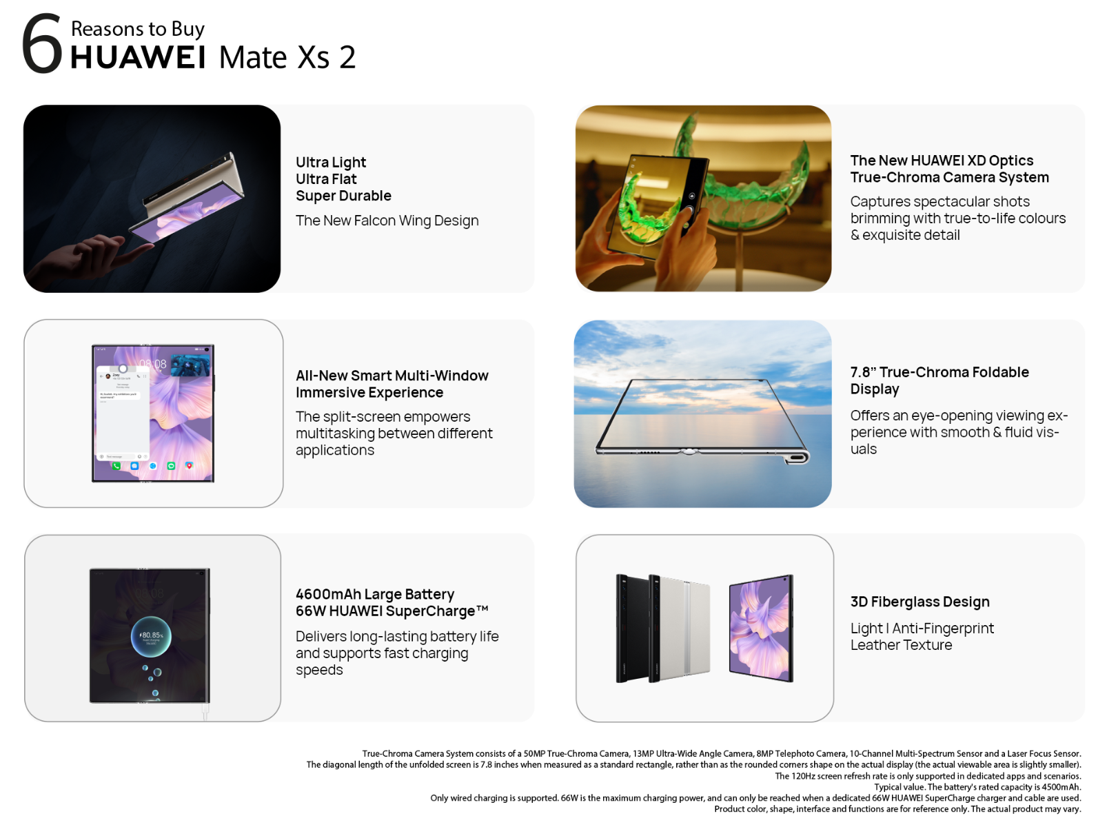 Unfolded Main Screen:7.8 inches Folded Main Screen:6.5 inches With a rounded corners design on the display, The claimed size is Main Screen:OLED up to 120 Hz refresh rate,1440 Hz high frequency PWM dimming, Main Screen:1.07 billion colours Resolution: Unfolded:2480 x 2200 Pixels Folded:2480 x 1176 Pixels The resolution measured as a standard rectangle, with a rounded Multi-touch, supporting up to 10 touch points Supported Black/White Unfolded: 156.5mm(H)*139.9mm(W)*5.4mm - 11.1mm(D) Folded: 156.5mm(H)*75.5mm(W)* 11.1mm(D) Note:1. Product size and related specifications are theoretical Approx. 255 g (including the battery) Note:1. The claimed weight does not include the weight of the screen film. 2. The actual weight may vary depending on the configuration, Lithium polymer battery LTE TDD/LTE FDD/WCDMA/HSPA+/DC-HSDPA/EVDO/CDMA1X/EDGE/GPRS, support VoLTE/ViLTE Note:* Functions available on the live network depend on the carrier network. * The availability of VoLTE/ViLTE depends on the network operators Snapdragon 888 4G , Octa-core ,1 x Cortex-X1@2.84 GHz + 3 x Cortex-A78@2.42 GHz + 4 x Cortex-A55@1.8 GHz Adreno 660 Downlink 4 × 4 MIMO: B1/B3/B38/B39/B41 supported Uplink: 64 QAM Downlink: 256 QAM 8GB RAM + 512GB ROM NM Card up to 256GB (not inbox) Power button and volume buttons Support GPS (L1 + L5 Dual band) / AGPS / GLONASS/ BeiDou(B1I+B1C+B2a Tri-band) / GALILEO (E1 + E5a Dual band) / QZSS (L1 + L5 Dual band) / NavIC Operating temperature: 0°C–35°C Storage temperature: -20°C– +45°C Capacity: 4600 mAh (typical)/4500 mAh (rated) Theoretical Charging time: About 0.61 hours (Note: The preceding data is obtained from lab data when the phone is charged with 66W HUAWEI SuperCharge. The actual charging time may vary depending on usage.) The following data is lab data. The actual call duration, standby time, video playing, music playing, 4G Internet access, and dual-card standby time vary according to the actual network conditions and usage habits. WCDMA: Theoretical call duration up to 21.9 hours, theoretical standby time up to 525.4 hours GSM: Theoretical call duration up to 30.1 hours, theoretical standby time up to 438.3 hours LTE TDD: Theoretical standby time up to 540.9 hours LTE FDD: Theoretical standby time up to 562.2 hours Video playback(unfolded): Up to 13.7 hours (theoretical) Music playback: Up to 38.1 hours (theoretical) Internet access through 4G(unfolded): Up to 10.8 hours (theoretical) 5%–95% Bluetooth 5.2, Support BLE, SBC, AAC, LDAC 802.11 a/b/g/n/ac/ax,2x2 MIMO,HE160,4096 QAM,8 Spatial-stream Sounding MU-MIMO *Need router support Download and upload peak physical rate up to 4Gbps *Need router support Supports the connection of up to eight devices USB Type-C, USB 3.1 GEN1 *This function should be used with the USB cable (non-standard USB cable, need to be purchased separately) that supports this function. Read Write mode/Card Emulation mode (payment by *SIM card, or HCE) is supported. *The SIM card used for SIM card payment can only be inserted into the SIM1 card slot. Not supported HUAWEI SuperCharge (Max 66 W) *HUAWEI SuperCharge cable and charger is required. Not supported Gravity sensor Infrared sensor Fingerprint sensor Hall sensor Barometric pressure sensor Gyroscope Compass Ambient light sensor Proximity sensor AF Laser Color temperature sensor Card slot 1: Nano-SIM card Card slot 2: Nano-SIM card or nano memory card (NM card) Note: Insert the NM card into card slot 2. Software Specifications