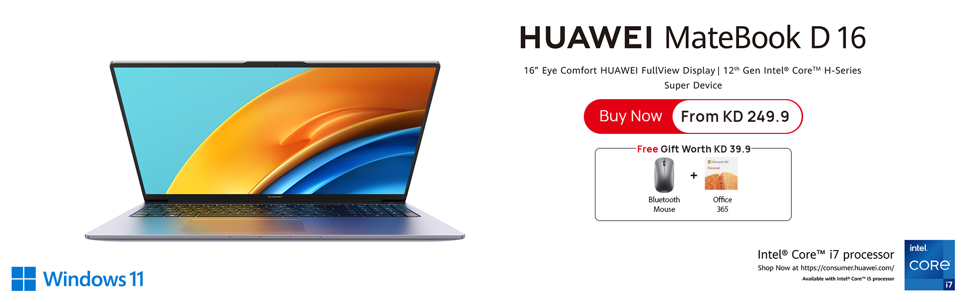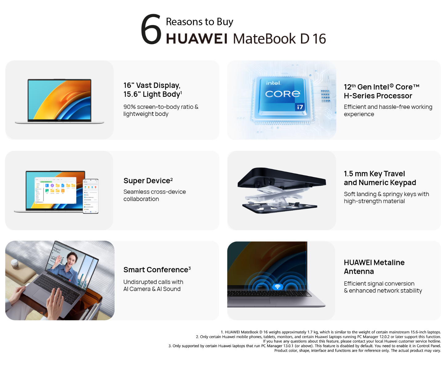 | Specifications | 16" Eye Comfort HUAWEI FullView Display 12th Gen Intel® Core™ H-Series Super Device 16" Eye Comfort HUAWEI FullView Display1 12th Gen Intel® Core™ H-Series Super Device2 16" Vast Display, 15.6" Light Body3 12th Gen Intel® Core™ H-series ProcessorSuper Device2 1.5 mm Key Travel and Numeric KeypadSmart Conference4 HUAWEI Metaline AntennaExpand your horizons More room to browse16-inch large screen, 16:10 golden aspect ratio and 90% screen-to-body ratio,5 providing a wider view. 16 inches Vast display16:10 Golden aspect ratio90% screen-to-body ratioTÜV Rheinland Low Blue Light (Hardware Solution) Certification1 Filters out blue light, displays vibrant colorsDC dimming, flicker-free More comfortable for extended periods of viewing100% sRGB wide color gamut6 Real image and web page colors Effortless mobile office tasks 16-inch vast display, as light as a 15.6-inch model.3 1.7 kg7 metallic body,8 allowing for a seamless mobile office experience across a vast display. Enhanced hardware for multiple useNext-generation processor with performance and efficiency cores Brand-new hardware upgrade to boost running speed. Powered by 12th Gen Intel® CoreTM i7-12700H Processor integrates 14 cores,10 increasing the number 97.30% CPU single-core performance improved by1220% Versatile large screen, meet all your needsThe 16-inch large screen works with Intel® CoreTM i7-12700H Processor, Numeric keypad, robust efficiency The brand-new numeric keypad doubles office efficiency in making reports, Camera switch AI Search key Brand-new text input experience The 1.5 mm key travel, along with a soft landing design, which makes rebounds Smart Conference, with AI Camera4 and AI Sound4 Here's a new handy tool for online meetings. AI Camera can even adjust A broader view The 1080P AI camera and 88° wide angle shooting allow for multiple people *The cross-device search file preview function will be implemented in the future software upgrade. Learn more about smart-office > Smart microphone noise cancellation The 4 mics are edge-shaped to reduce blocking, and achieve 360° sound Robust signal via HUAWEI Metaline Antenna HUAWEI Metaline Antenna ensures a stable network in complex network environments. 56% higher Signal conversion efficiency16 55% higher Weak-signal download rate16,17 Multiple ports, for greater versatility The lightweight HUAWEI MateBook D 16 still manages to pack multiple types of USB-A (USB 2.0) USB-A (USB 3.2 Gen 1) HDMI 2.0 USB-C (for charging and data transfers) USB-C (all-purpose use) 3.5 mm earphone jack Robust battery life The 2nd generation 65 W Pocket Charger is only 137 g18 and 30% smaller,19 and Charging power 65 W Battery capacity 60 Wh Super Device Drag to connect multiple devices2 Super Device facilitates seamless cross-device collaboration, allowing a vast Cross-device collaboration Cross-device transfers21 Transfer files between the laptop and connected devices in literally the blink of an eye. Cross-device searching22 Search for and find files and images on a connected device, directly from the device on hand. Wireless projection Laptop images can be wirelessly projected to monitors23 and Huawei Visions.24 Pop-up pairing,25 instant connections Devices such as earphones, speakers, mouses, keyboards, and printers are Tried, Tested, and Proven We subject HUAWEI MateBook D 16 to rigorous quality testing, so you can USB-C port durability test Fingerprint key durability test Keyboard life test Hinge life test Touchpad life test HUAWEI MateBook D 16 come with a 16:10 ratio of bezel-less screen, Mystic Silver Windows 11 Home Dimensions