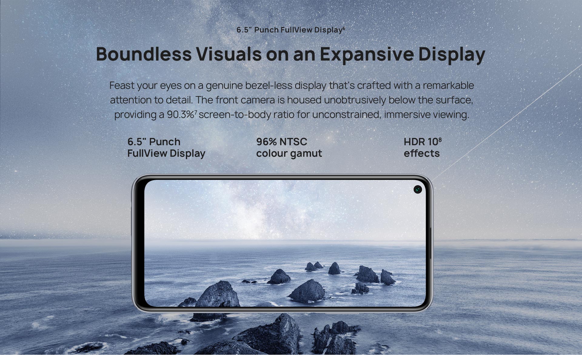 2400 x 1080 *The resolution measured as a standard rectangle, with a rounded corners design on the dewdrop display,the effective pixels are slightly less. |