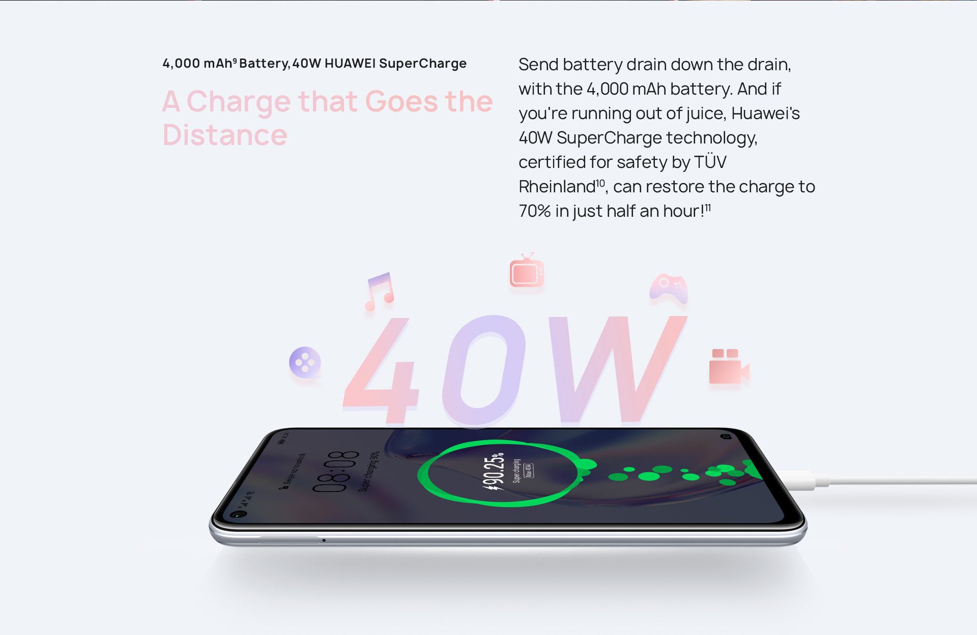 HUAWEI SuperCharge (Max 40 W) *HUAWEI SuperCharge cable and charger is required. |