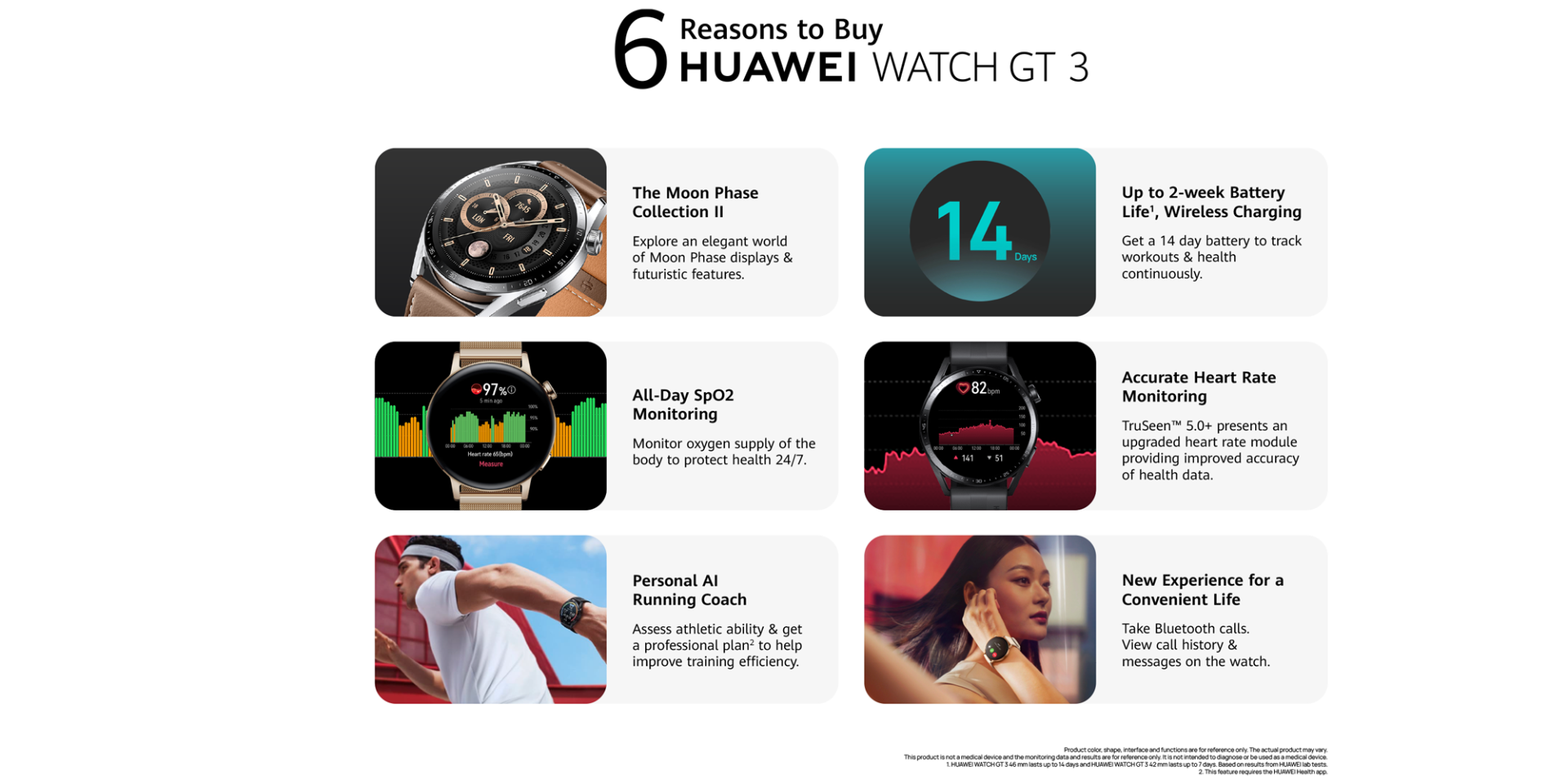 | Specifications | 45.9 mm x 45.9 mm x 11 mm 42.3 mm x 42.3 mm x 10.2 mm *Product size, product weight, and related specifications are theoretical values only. Actual measurements between 46 mm 42 mm 140-210 mm 130-190 mm HUAWEI WATCH GT 3 46 mm Approximately 42.6 g(without the strap) HUAWEI WATCH GT 3 42 mm Approximately 35 g(without the strap) *Product size, product weight, and related specifications are theoretical values only. Actual measurements between individual HUAWEI WATCH GT 3 46 mm 1.43 inches AMOLED Colour Screen HUAWEI WATCH GT 3 42 mm 1.32 inches AMOLED Colour Screen The AMOLED touchscreen supports slide and touch gestures. Watch Case
