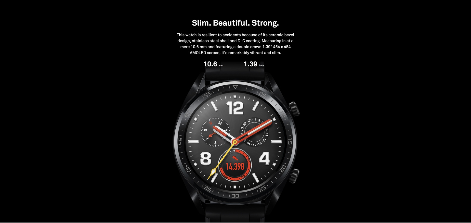 Active / Sport / Classic Edition:46.5 mm x 46.5 mm x 10.6 mmWrist coverage range 14~21 cmElegant Edition:42.8 mm x 42.8 mm x 10.5 mmWrist coverage range 13~19 cm |
