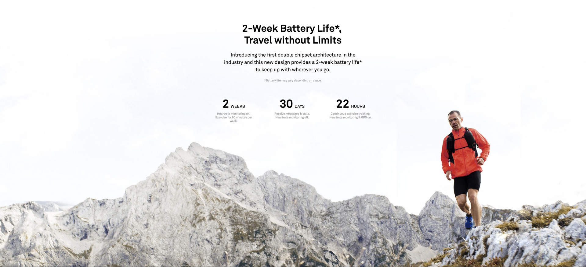 Battery Life:Active / Sport / Classic Edition:14 days for typical use.Elegant Edition:7 days for typical use.(The typical usage scenarios are decided based on the user habits. The specific battery life depends on the user habits and usage frequency.)Charger Voltage and Current Requirements:5V 0.5A / 1A / 1.5A / 2A*Typical value. Actual capacity may vary slightly. This capacity is the nominal battery capacity. The actual battery capacity for each individual product may be slightly above or below the nominal battery capacityThe actual working time may slightly differ due to different user habits and band configurations.