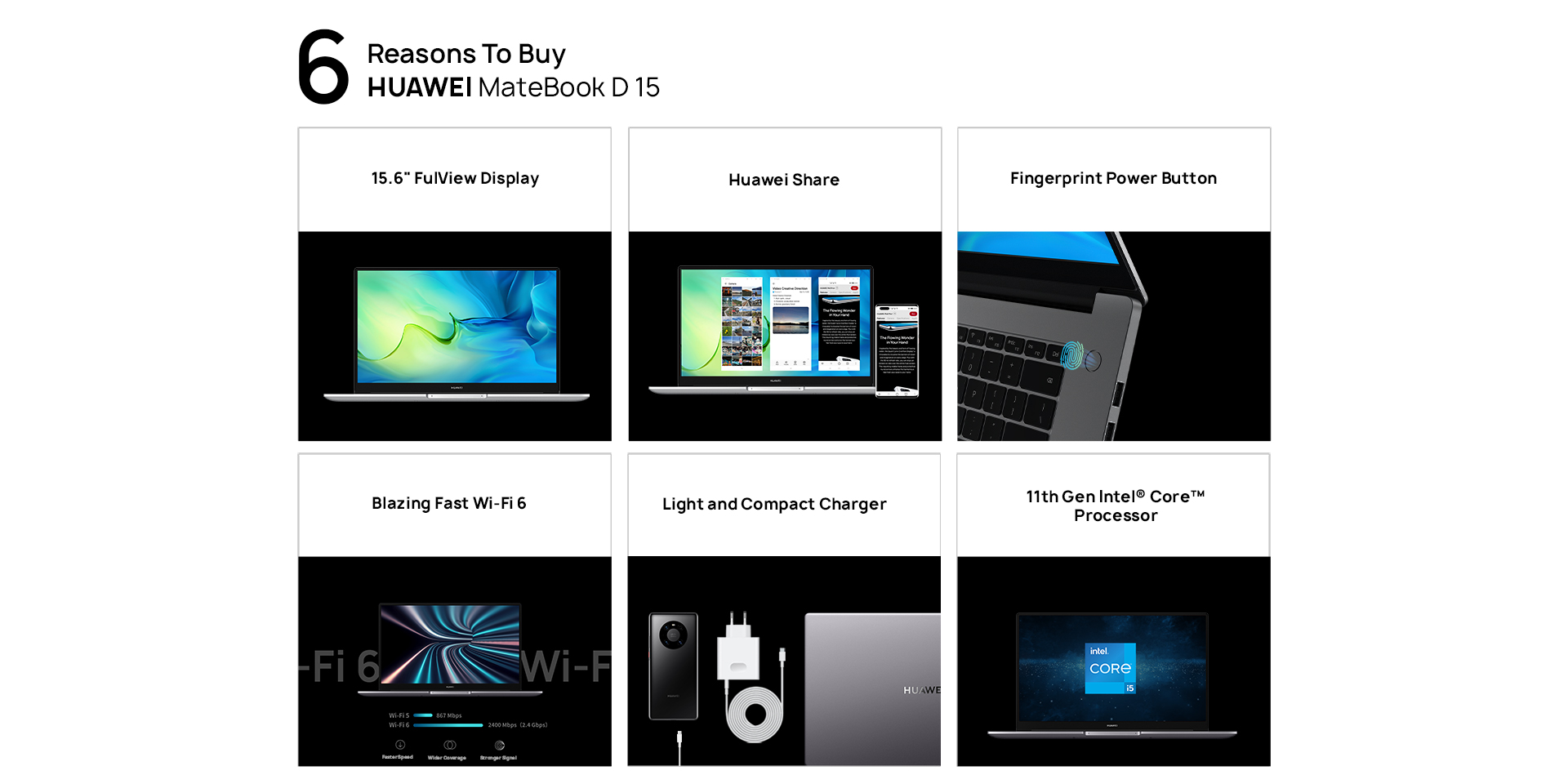 Size: 15.6-inch Type: IPS Resolution: 1920 x 1080 pixels, 141 pixels per inch (PPI) Aspect ratio: 16:9 Viewing angle: 178 degrees Contrast ratio: 800:1 Brightness: 250 nits (typical) The laptop has obtained TÜV Rheinland Low Bluelight Certification and Dimensions (H × W × D): 16.9 mm × 357.8 mm × 229.9 mm (0.67 in. × 14.09 in. × 9.05 in.) Weight: 1.56 kg (3.44 lb) Color: Space Gray 11th Gen Intel® CoreTM i3-1115G4 processor 11th Gen Intel® CoreTM i5-1135G7 processor 11th Gen Intel® CoreTM i7-1165G7 processor Intel® UHD Graphics Intel® Iris® Xe Graphics 8GB LPDDR4X/8GB DDR4/16GB DDR4 256GB/512GB NVMe PCIe SSD Fingerprint power button 3.5mm headset and microphone 2-in-1 jack x 1 USB-C x 1 (You can transfer data, charge your MateBook D 15 using this port.) HDMI x 1 USB-A (USB 3.2 Gen 1) x 1 USB-A (USB 2.0) x 2 IEEE 802.11a/b/g/n/ac/ax, 2.4GHz/5GHz, 2x2 MIMO Bluetooth 5.1 720P HD recessed camera Digital microphone x 2, speaker x 2 Fingerprint sensor and Hall sensor Material: lithium polymer Capacity: 42 Wh (Rated capacity) Cell core number: 3 65 W USB-C power adapter Input: 100–240 V AC, 50 Hz/60 Hz Output: 5 V/2 A, 9 V/2 A, 12 V/2 A, 15 V/3 A, and 20 V/3.25 A. Charging temperature: 0°C to 40°C (32°F to 104°F) Working temperature: 0°C to 35°C (32°F to 95°F) Storage temperature: –10°C to +45°C (14°F to 113°F) 5% to 95% (non-condensing) Charging indicator Camera indicator Standard: IEEE 802.11a/b/g/n/ac/ax Frequency bands: 2.4GHz and 5GHz Antenna: 2x2 MIMO Encryption mode: WPA/WPA2/WPA3 Bluetooth 5.1 Windows 11 Home 64bit Microsoft input method Microsoft Edge (Default browser) Immersive surround sound Huawei Share Huawei PC Manager Performance mode (In hotkey mode, press Fn + P) Display Manager (Eye Comfort Mode) Huawe factory reset (F10) Installation and uninstallation of third-party apps should follow regional customized policies. Local update: Using USB flash disk (customer service) Online update