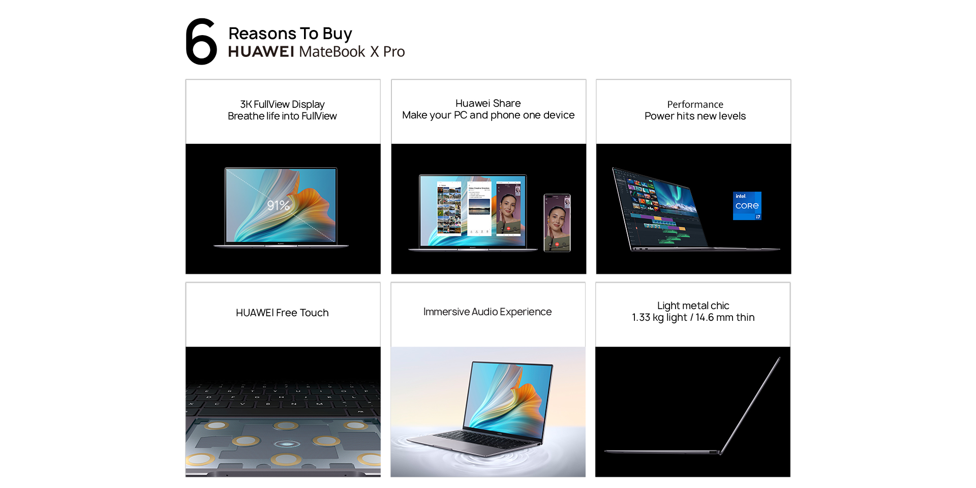 IEEE 802.11 a/b/g/n/ac/ax 2.4 GHz and 5 GHz 2 x 2 MIMO Support WPA/WPA2/WPA3 Bluetooth 5.1 USB-C * 2, Charging/Display(Dual 4K@60Hz,Max.3840 x 2160 resolution)/Data(Max.40 Gbps) 3.5 mm Headset and Microphone Jack x 1 Full-size Backlit Chiclet Keyboard Touchpad with Multi-touch and HUAWEI Free Touch Huawei Share Built-in Fingerprint Power Button 1 MP Recessed Camera (720P HD) Speaker x 4 Microphone x 2 Huawei Share* HUAWEI MateBook Manager HUAWEI Factory Reset Eye Protection Mode *Huawei Share supports Multi-screen Collaboration between a Huawei smartphone and a HUAWEI MateBook. HUAWEI Matebook X Pro HUAWEI 65 W USB-C Power Adapter USB-C Charger Cable Quick Start Guide Warranty Card |
