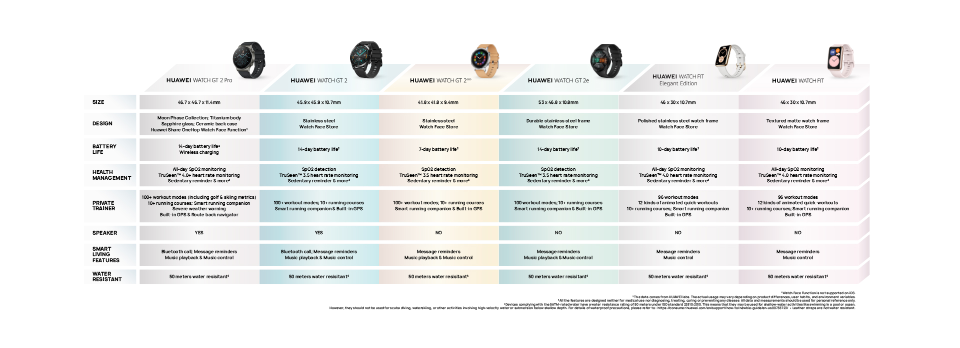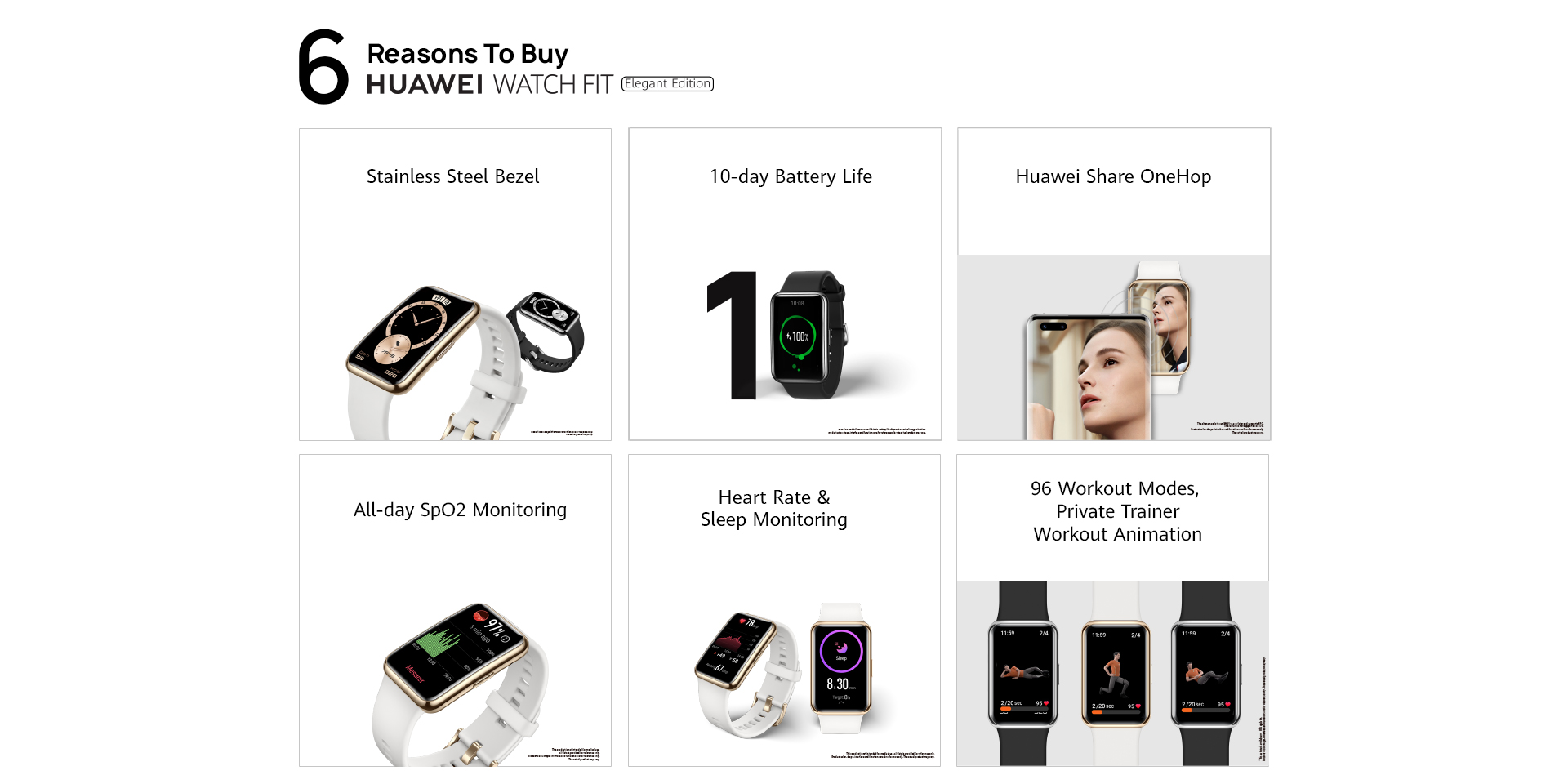Basic sleep tracking is enabled, heart rate monitoring is enabled. Screen is checked briefly 200 times per day, 50 messages, 3 calls and 3 alarms reminding in 24 hours, and workout for 30 minutes per week. HUAWEI TruSleep™ is enabled, heart rate monitoring is enabled. Screen is checked briefly 500 times per day, 50 messages, 3 calls and 3 alarms reminding in 24 hours, and workout for 60 minutes per week. GPS mode: 12 hours (The typical usage scenarios are decided based on the user habits. The specific battery life depends on the user habits and usage frequency.) Watch x 1 Charging Cradle (including the charging cable) x 1 Quick Start Guide & Safety Information & Warranty Card x 1 *The preceding specifications are theoretical values based on product design. To provide accurate product information, specifications, and features, HUAWEI may make real-time adjustments to the preceding specifications, so that they match the product performance, specifications, indexes, and components of the actual product. Product information is subject to such changes and adjustments without notice. |